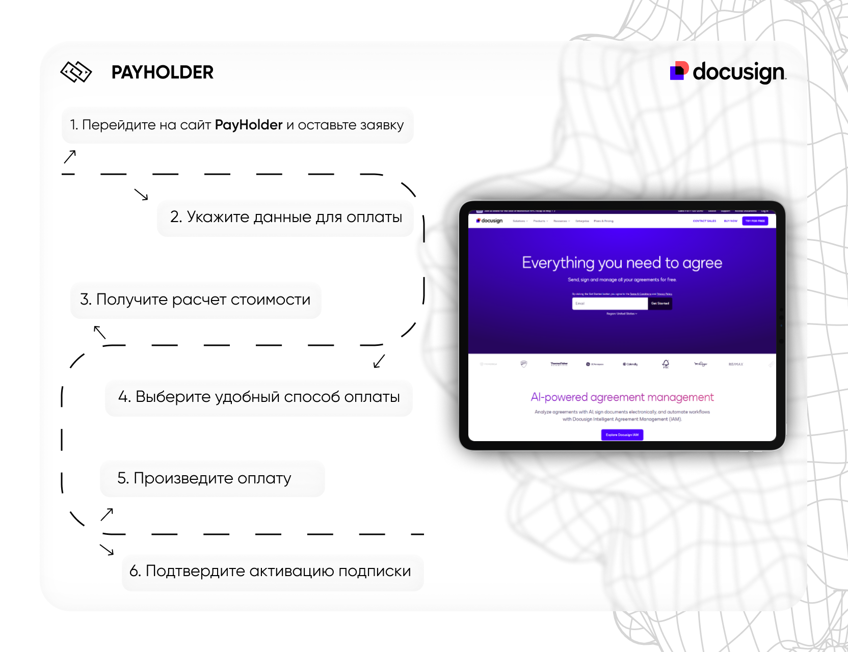 После завершения всех действий PayHolder выполнит оплату за вас. Ваша подписка на DocuSign будет активирована, и вы получите доступ ко всем функциям сервиса без задержек.