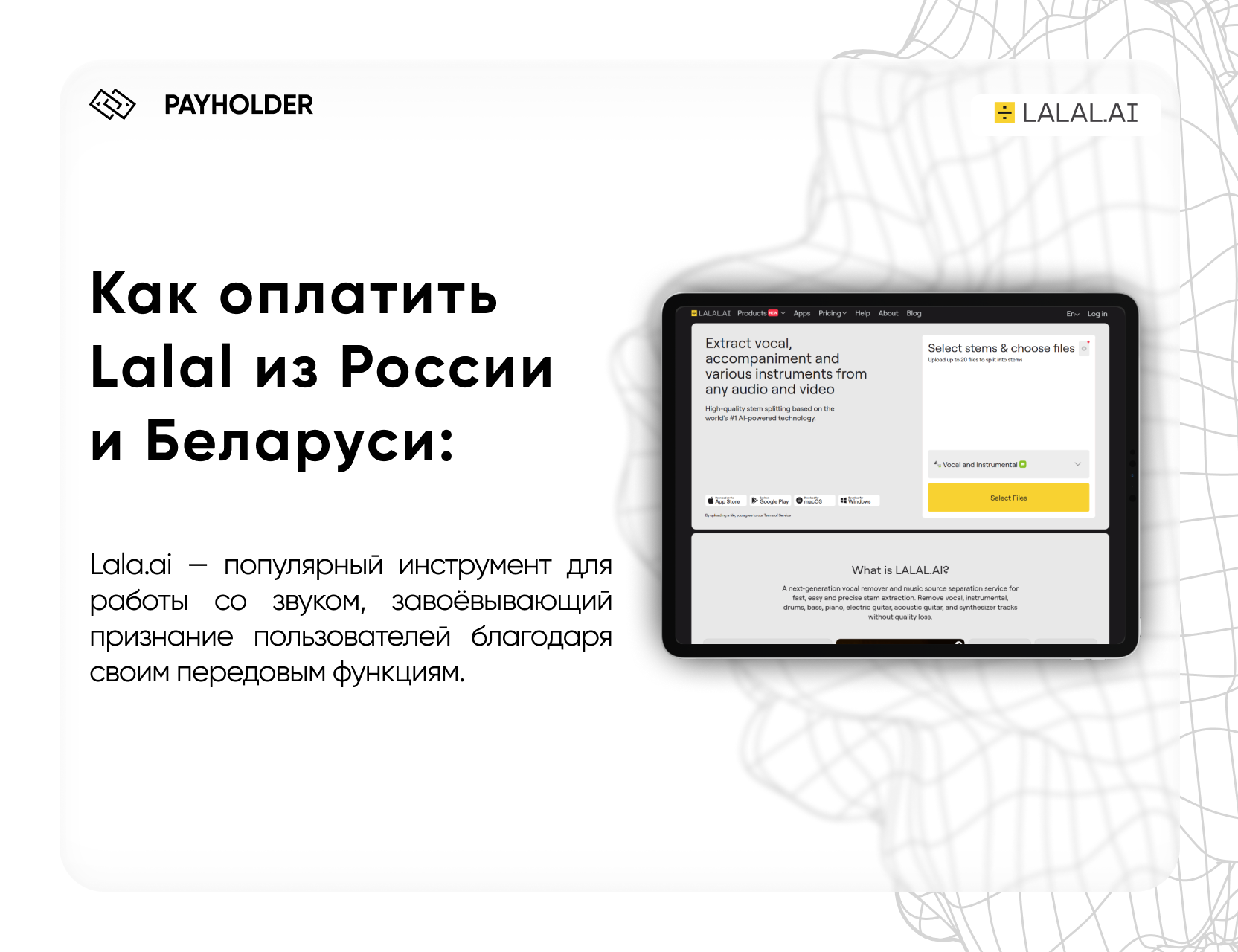Lala.ai — популярный инструмент для работы со звуком, завоёвывающий признание пользователей благодаря своим передовым функциям. Однако многие пользователи в России и Беларуси сталкиваются с трудностями в оплате сервиса из-за действующих ограничений. В этом гиде мы расскажем о современных способах оплаты и предложим PayHolder как лучший и самый безопасный вариант.