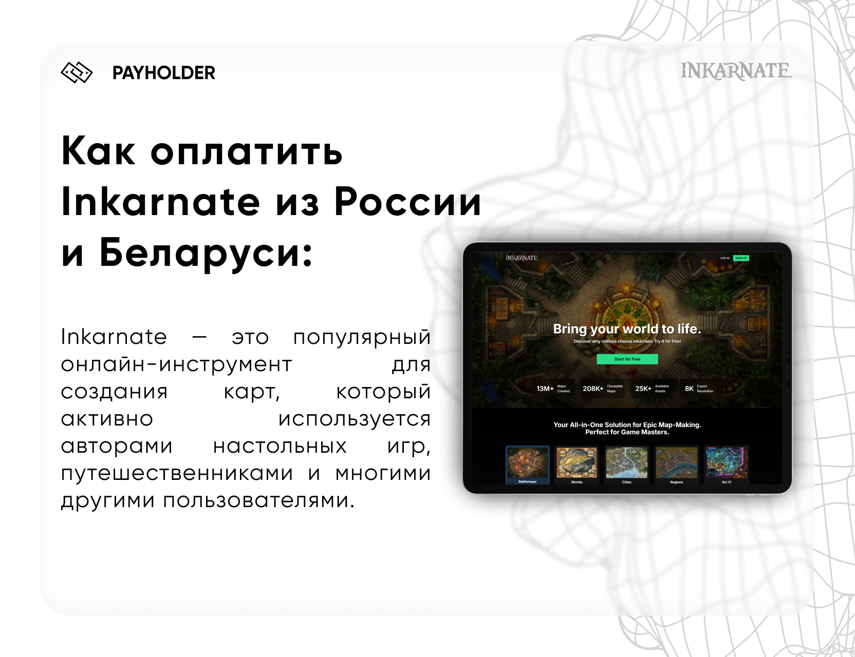 Inkarnate — это популярный онлайн-инструмент для создания карт, который активно используется авторами настольных игр, путешественниками и многими другими пользователями. Однако, многие из них сталкиваются с трудностями при попытке купить подписку Inkarnate. В этом гиде мы рассмотрим доступные способы оплаты и расскажем, как использовать PayHolder, чтобы сделать процесс оплаты простым и безопасным.