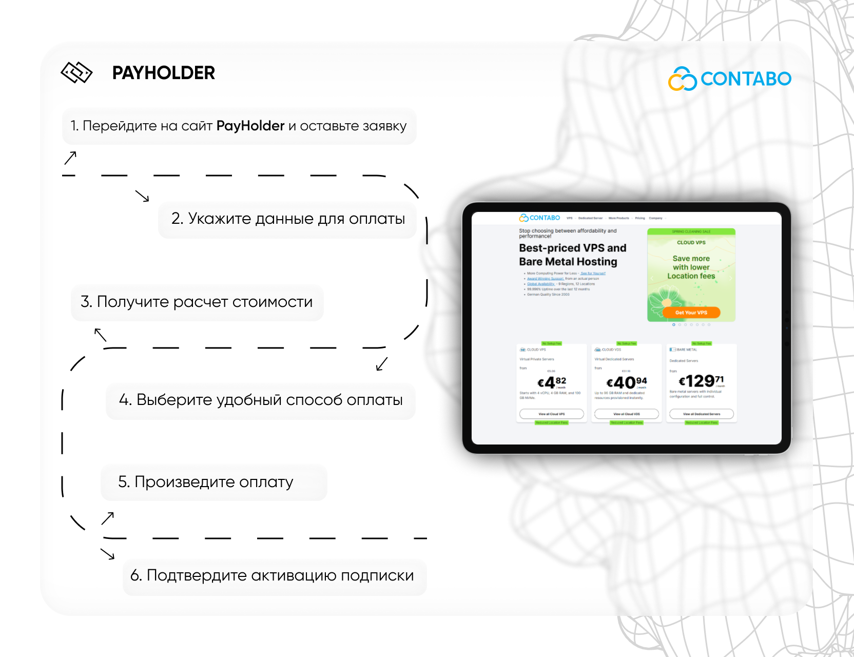 Простые шаги помогут вам оплатить подписку Contabo с помощью PayHolder:
