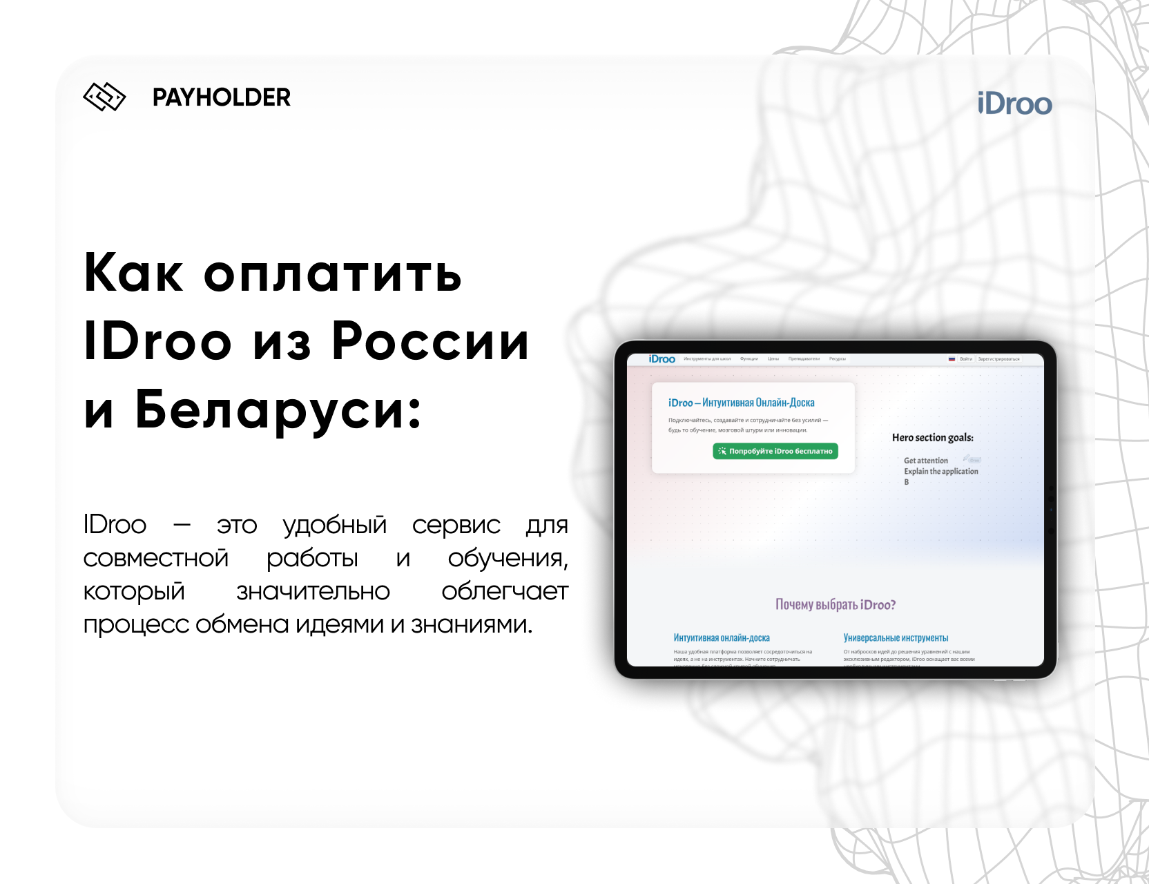IDroo — это удобный сервис для совместной работы и обучения, который значительно облегчает процесс обмена идеями и знаниями. Однако многим пользователям из России и Беларуси приходится решать сложные вопросы, связанные с оплатой подписки на IDroo из-за введенных ограничений. В данном руководстве мы рассмотрим, как оплатить подписку IDroo сейчас, какие существуют варианты оплаты и почему PayHolder — это лучший выбор для решения этой задачи.