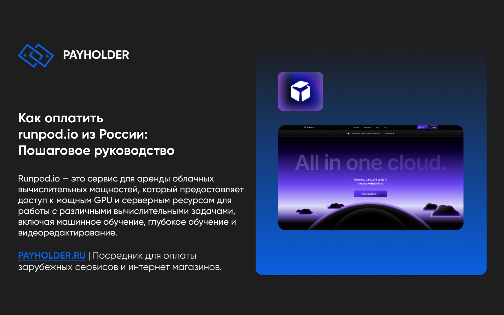 Runpod.io — это сервис для аренды облачных вычислительных мощностей, который предоставляет доступ к мощным GPU и серверным ресурсам для работы с различными вычислительными задачами, включая машинное обучение, глубокое обучение и видеоредактирование. Однако пользователи из России могут столкнуться с трудностями при оплате подписки на Runpod.io из-за международных ограничений. В этой статье мы расскажем, как оплатить Runpod.io из России с помощью PayHolder, чтобы продолжить использовать все возможности этой платформы.