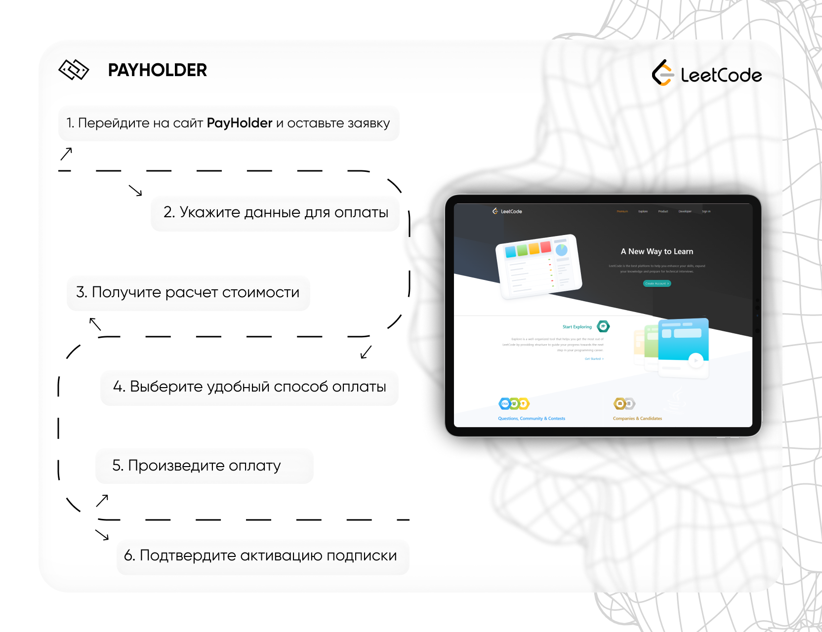 Теперь давайте рассмотрим пошаговый процесс, который поможет вам оплатить подписку LeetCode через PayHolder.